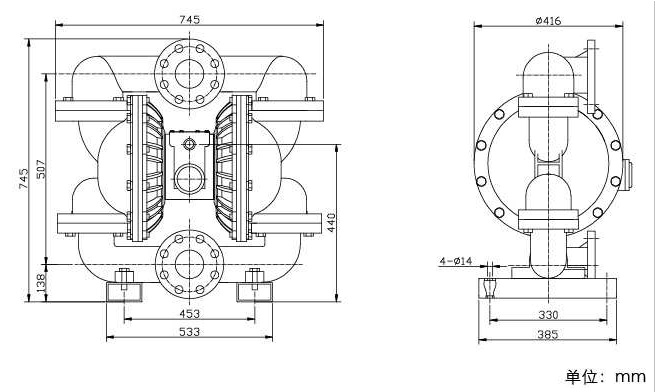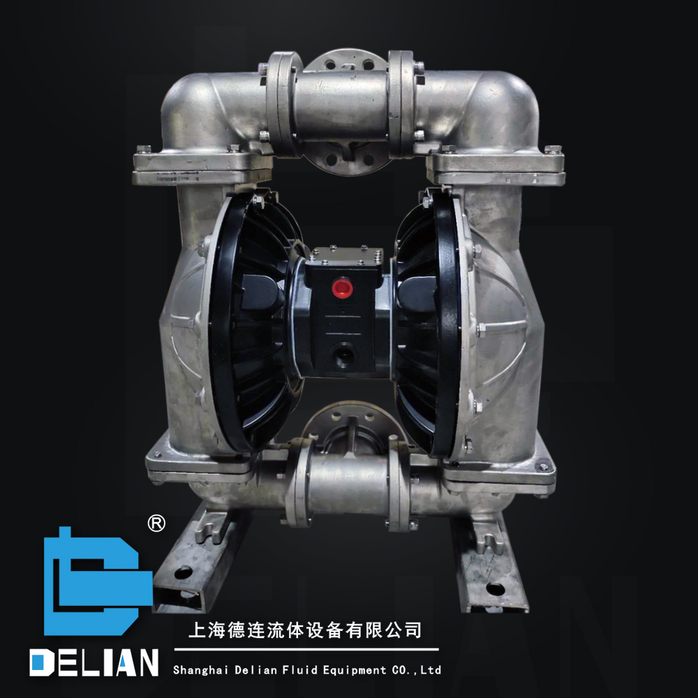 LEIVER系列气动隔膜泵是一种新型的输送设备,是目前国内最新颖的泵类。采用压缩空气为动力源,对于各种腐蚀性液体,带颗粒的液体,高粘度、易挥发、易燃、剧毒的液体,均能抽光吸尽。 本公司生产的隔膜泵共有六种规格。进出口尺寸分别为1/4″、1/2″、3/4″、1″、 1.5″、2″、3″、4″,流体部件材质有:铝合金、球墨铸铁、聚丙烯、不锈钢、隔膜根据不同膜片材质分别有:丁腈橡胶、氯丁橡胶、聚乙烯、三道橡胶、聚醚橡胶、氟橡胶、聚四氟乙烯、聚二氟乙烯。以满足不同液体介质的需要。 LEIVER系列气动隔膜泵工作原理:在隔膜泵的两个对称工作腔中,各装有一块有弹性的隔膜,连杆将两块隔膜结成一体,压缩空气从泵的进气接头进入中间体后,推动两个工作腔内的隔膜,驱动连杆联结的隔膜同步运动。与此同时,另一工作腔中的气体则从其隔膜的背面排出泵外。当活塞达到行程终点,配气阀机构则自动的将压缩空气引入另一工作腔,推动隔膜泵朝反向运动,这样就形成了两个隔膜的同步往复运动。每个工作腔中又设置两个单向球阀,隔膜的往复运动,造成工作腔内容积的改变,迫使两个单向球阀交替的开启和关闭,从而使液体连续的吸入和排出。