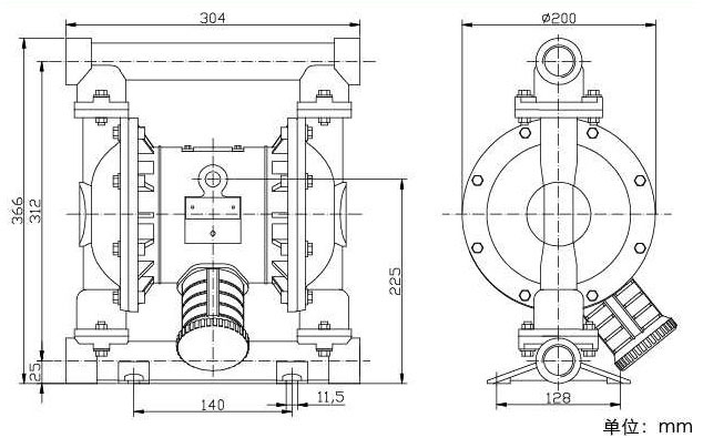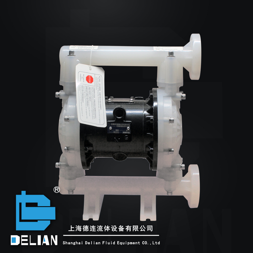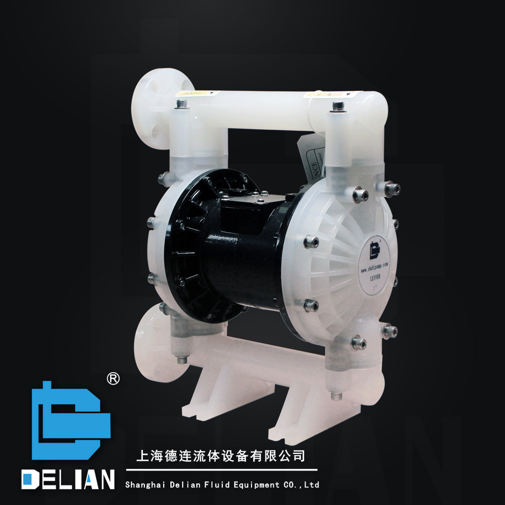 本公司生产的LEIVER系列气动隔膜泵是一种新型的输送设备,是目前国内最新颖的泵类。采用压缩空气为动力源,对于各种腐蚀性液体,带颗粒的液体,高粘度、易挥发、易燃、剧毒的液体,均能抽光吸尽。 本公司生产的隔膜泵共有六种规格。进出口尺寸分别为1/4″、1/2″、3/4″、1″、 1.5″、2″、3″、4″,流体部件材质有:铝合金、球墨铸铁、聚丙烯、不锈钢、隔膜根据不同膜片材质分别有:丁腈橡胶、氯丁橡胶、聚乙烯、三道橡胶、聚醚橡胶、氟橡胶、聚四氟乙烯、聚二氟乙烯。以满足不同液体介质的需要。 LEIVER系列气动隔膜泵工作原理:在隔膜泵的两个对称工作腔中,各装有一块有弹性的隔膜,连杆将两块隔膜结成一体,压缩空气从泵的进气接头进入中间体后,推动两个工作腔内的隔膜,驱动连杆联结的隔膜同步运动。与此同时,另一工作腔中的气体则从其隔膜的背面排出泵外。当活塞达到行程终点,配气阀机构则自动的将压缩空气引入另一工作腔,推动隔膜泵朝反向运动,这样就形成了两个隔膜的同步往复运动。每个工作腔中又设置两个单向球阀,隔膜的往复运动,造成工作腔内容积的改变,迫使两个单向球阀交替的开启和关闭,从而使液体连续的吸入和排出。